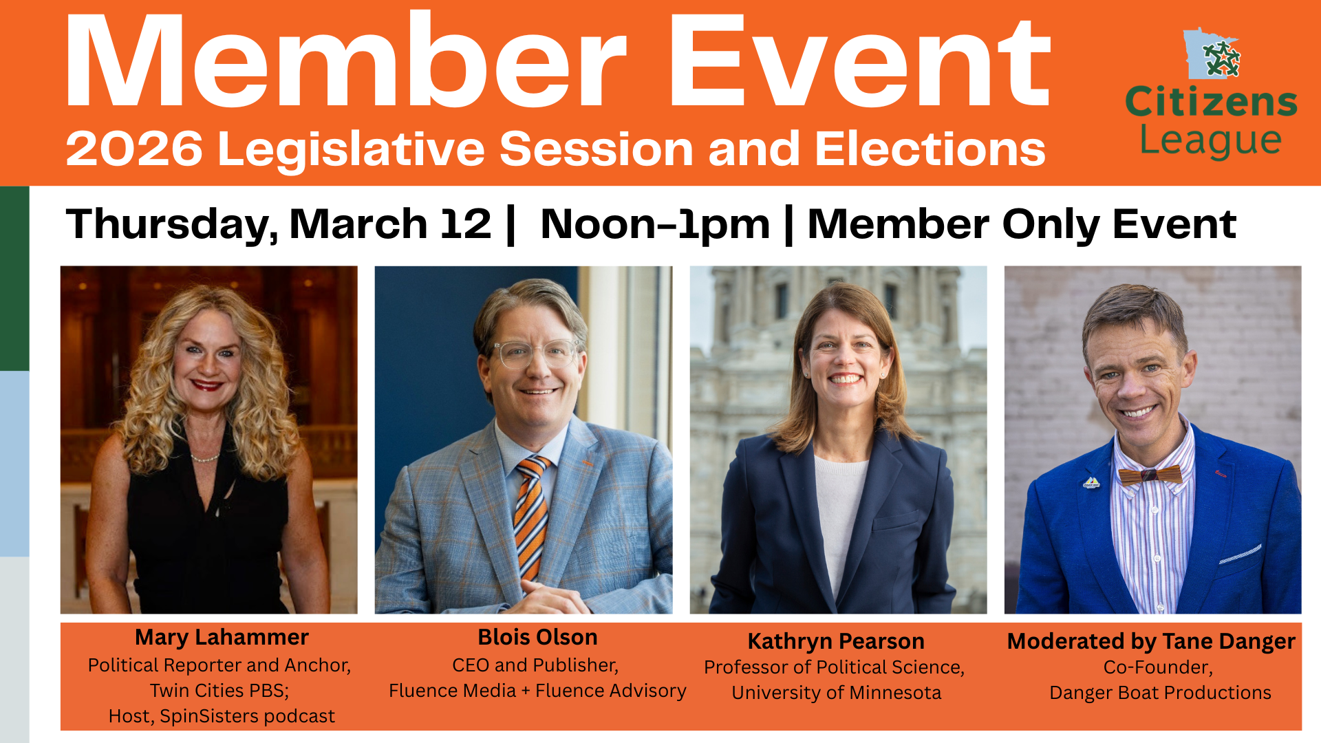 Join us on Thursday, March 12 from noon – 1pm to hear from a panel of experts as we break down current events and talk about what to expect over the next several months in Minnesota politics: